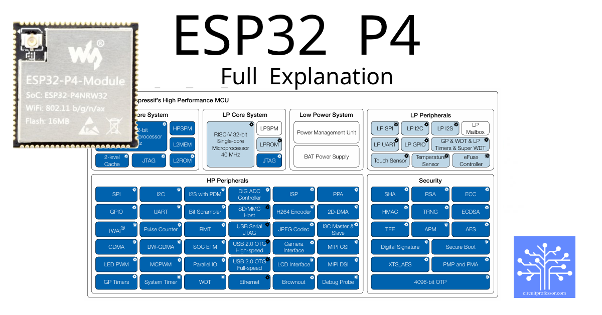 The ESP32 P4 microcontroller represents a leap forward in integrating advanced multimedia functions into a compact, high-performance System on Chip (SoC). Designed with modern multimedia and human-machine interface (HMI) applications in mind, it offers a versatile set of hardware accelerators for image, video, and display processing, enabling developers to build sophisticated, responsive, and visually rich embedded solutions.